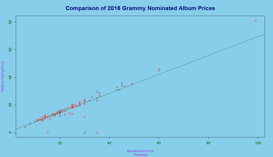 After sifting through many Excel files, I found a claim that fit my angle, outlining last year’s Grammy nominated albums: Are major retailers stealing money from some of our favorite artists? I decided to approach this very provincially, through the use of two distinct variables. One was the Manufacturer’s Retail Selling Price (MRSP), which was the price they predicted the album would go for. The other was Retail Selling Price, or the price major retail outlets (like Walmart or Target) set after receiving the albums in store. If there was a significant difference between the two, then the artist was getting cheated out of the money they deserved.